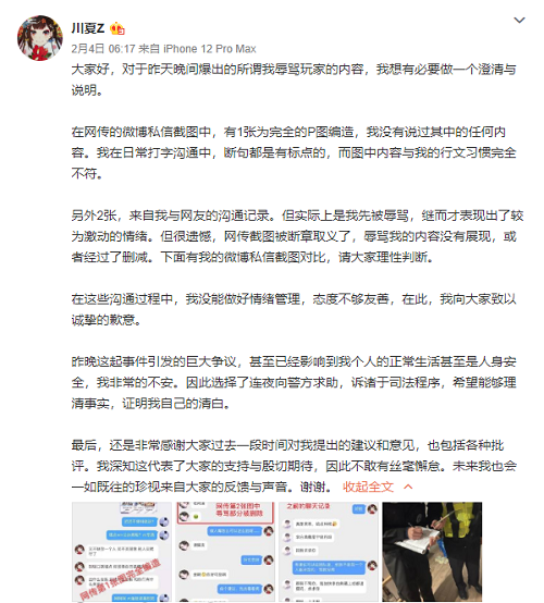 关菲菲在2月4日发微博澄清了最近的风波。(图片链接:关菲菲澄清微博)她说网传的辱骂内容有假,一张是P的,另外两张是她先被骂才生气,但被断章取义了。她承认自己情绪管理不好,态度不好,道歉了。(图片链接:关菲菲私信截图)她还因为这件事影响了生活安全,连夜报警了。