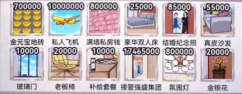 金元宝地砖、私人飞机、玻璃门、老板椅、满墙私房钱、豪华双人床、结婚纪念照、补给套餐、接管强盛集团、氛围灯、真皮沙发、金银花